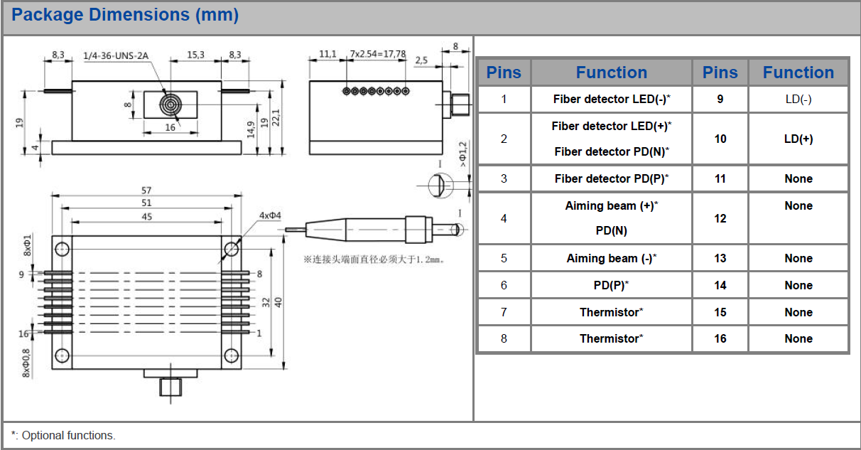 - Optional functions: red aiming beam, thermistor, power PD, and fiber detector